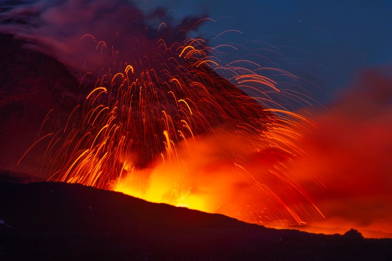 Hoewel het zaterdag bewolkt was, was de uitbarsting van de vulkaan op sicilië een spektakel.
