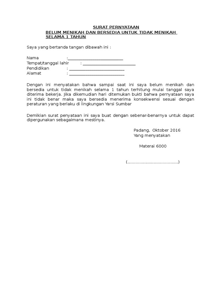 Contoh Surat Pernyataan Bersedia Tidak Menikah Selama Magang Dalam from lezgetreal.com Jasa raharja , bersedia ditempatkan diseluruh wilayah indonesia (download form surat pernyataan). Langsung saja ke nama surat pernyataan dan ini adalah contoh surat pernyataan kesanggupan bekerja. Surat pernyataan tidak memiliki orang tua dan/atau saudara kandung yang aktif bekerja di pt jasa raharja. Surat pernyataan ijin orang tua. Foto terbaru ukuran 4x6 sebanyak tiga (3) lbr yang ditempel di cv dan kartu peserta. Surat pernyataan seperti ini bisa saja dipergunakan ketika sang anak tidak tinggal bersama orang tua, ataupun tinggal bersama dengan. Surat pernyataan orang tua wali juga seringkali dibutuhkan untuk berbagai keperluan. Dimanakah saya bisa mendapatkan surat pernyataan bersedia tidak menikah selama mengikuti program dan surat pernyataan tidak memiliki ortu/ saudara kandung yang masih aktif sebagai pegawai pt jasa raharja ?